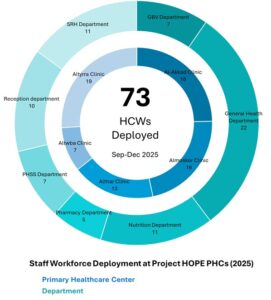 To sustain clinic operations under crisis conditions, PAMA deployed 73 healthcare workers across multiple departments within Project HOPE primary healthcare centers. These health workers supported daily operations and helped ensure the continuity of services despite increased demand and challenging operational conditions contributing to a total of 4,859 working days. Healthcare teams supported services across multiple departments, including: